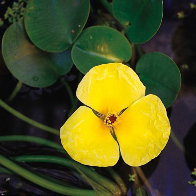 Hydrocleys nymphoides. Water poppy. A tender tropical decorative species from Brasil produces yellow flowers with 3 petals.