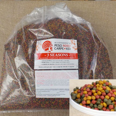 3 SEASONS - Granular fish food, ø 6 mm - Bag 3 kg. Ideal for goldfishes and koi too, on Spring, Summer and Autumn.