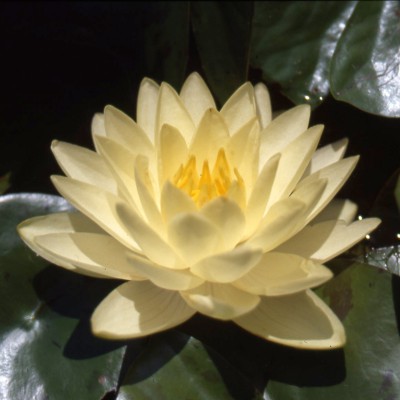 Nymphaea Hauzemberg. Medium waterlily. Very light yellowish flowers water lily.