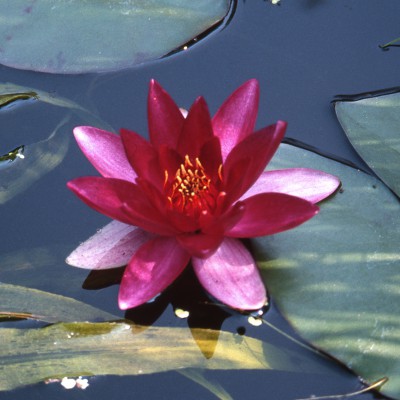 Nymphaea Chateau Le Rouge. Small water lily, with vivid red burgundy flowers. Ancient variety created bt french hybridizer Bory Latour-Marliac.