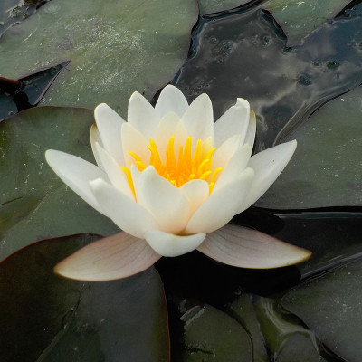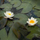 Nymphaea Geisha Girl - Small water lily . Free-flowering variety with original marble leaves. and ivory white flowers. Modern variety created by the english nursery Dorset Waterlily Co.