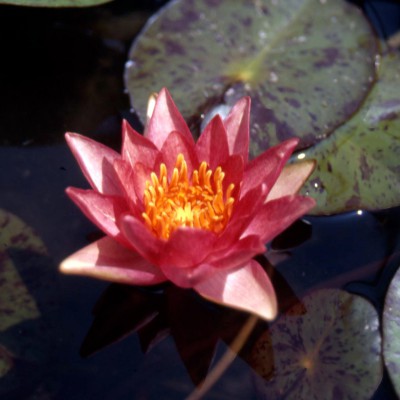 Nymphaea Robinsoniana. Small water lily. Ancient free-flowering variety, with original shape and color flowers. Ancient variety created by the french hybridizer Bory Latour-Marliac in 1895.