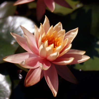 Nymphaea Colorado. Medium water lily. It's star shape fragrant flowers, up on the water. Modern variety created by the american hybridizer Dr. Kirk Strawn in 1994.