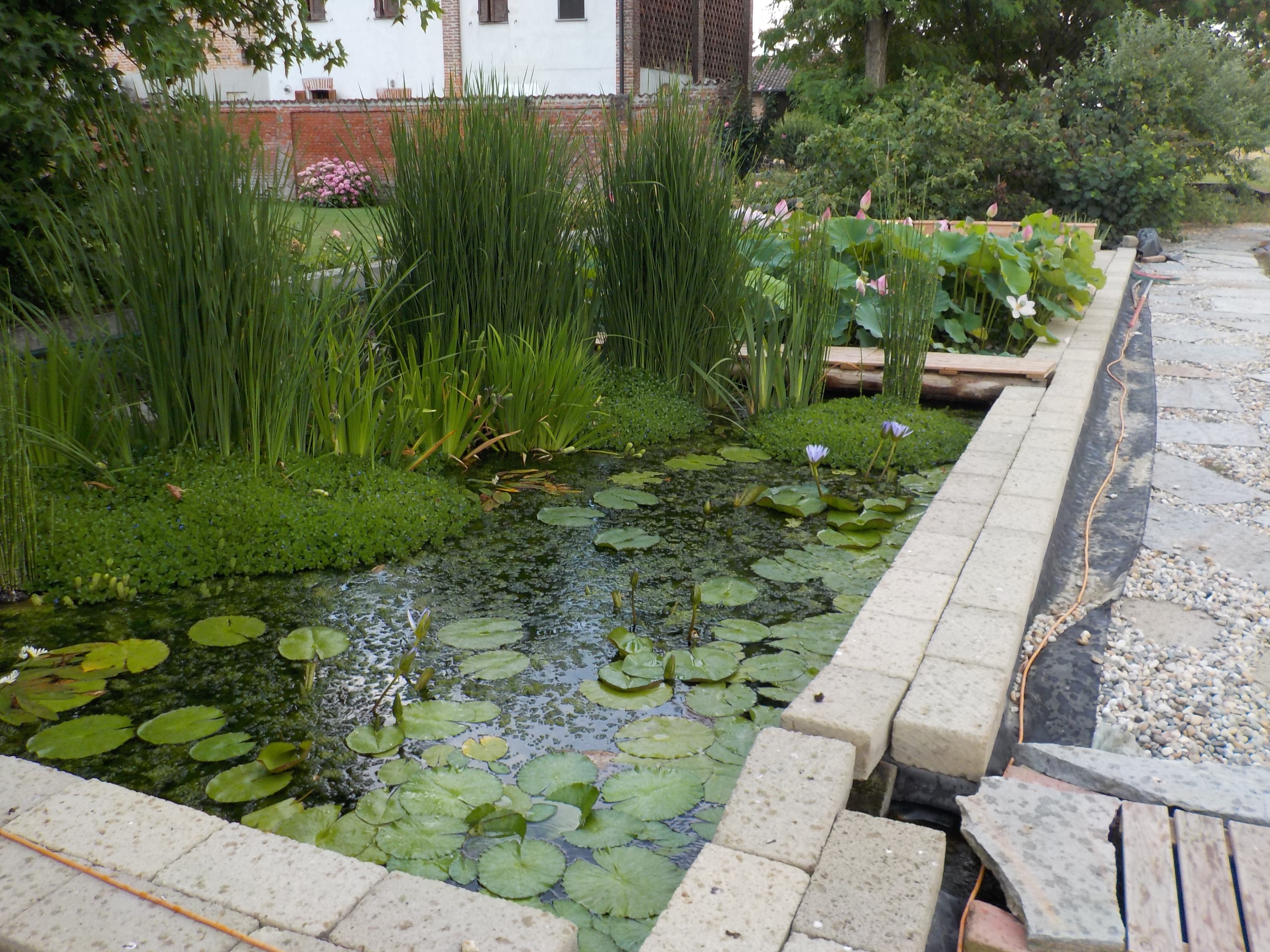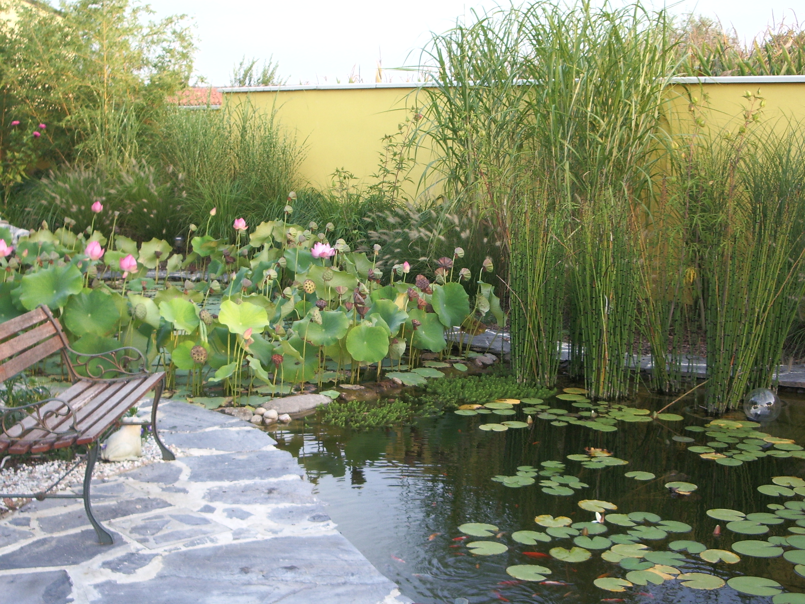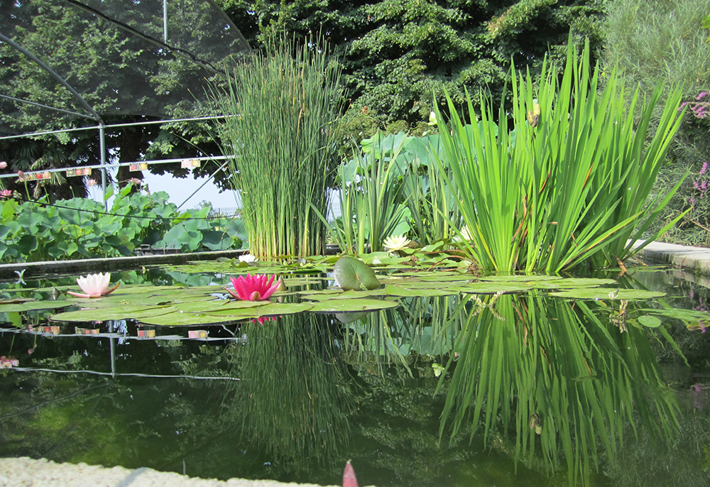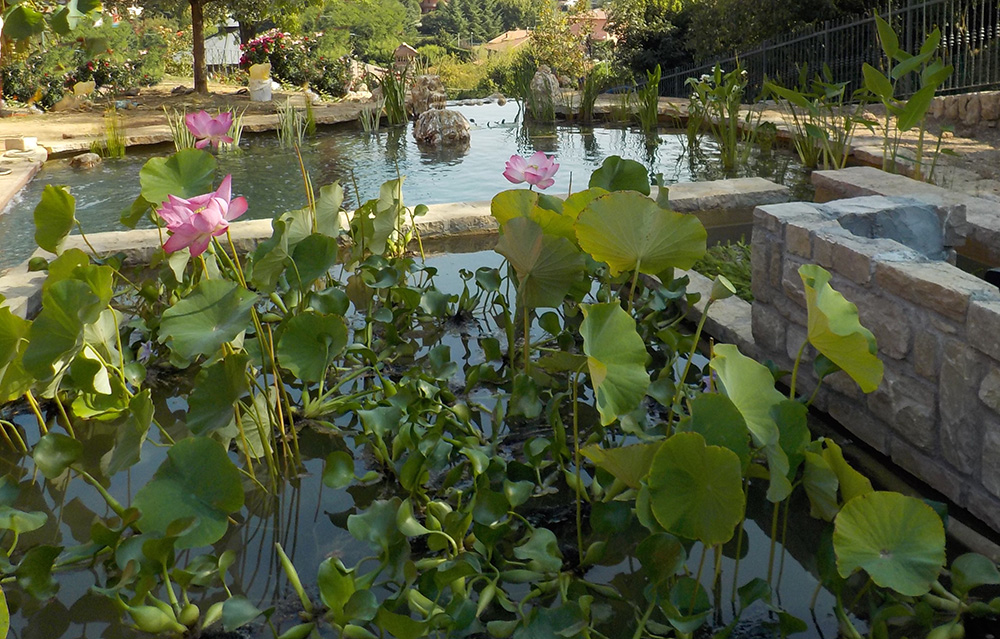 Lotus flowers and water lilies, aquatic and marsh plants, floating and oxygenating plants coexist in an ecosystem where fish and microorganisms essentially produce "food" (in the form of "pollutants", mineral salts and carbon dioxide), and the plants that grow thanks to the absorption, and therefore purification of these natural fertilizers, give the aquatic ecosystem clean and oxygenated water.