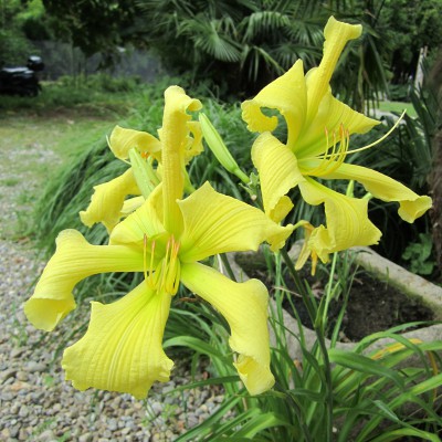 Hemerocallis "Augusto Bianco.". Beautiful yellow flowers, with a original orchid shape.