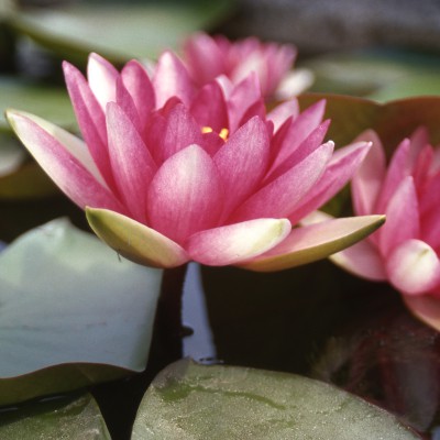 Nymphaea Conqueror. Large water lily. Free-flowering variety with very original bicolor flowers, red-purple shades of white. Ancient variety created by the french hybridizer Bory Latour-Marliac in 1910.