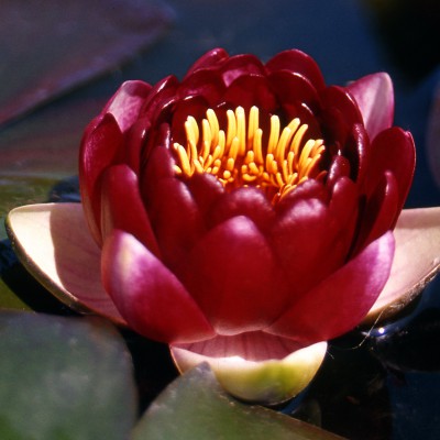 Nymphaea Perry's Deepest Red. Medium water lily, with very deep purle double flowers. Modern variety created by the american hybridizer Mr. Perry D. Slocum nel 1990.