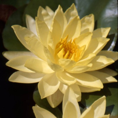 Nymphaea Yellow Sensation. Ninfea grande. Varietà moderna rifiorente con grandi fiori gialli stellati doppi, creata dall'ibridatore americano Perry D. Slocum nel 1991.