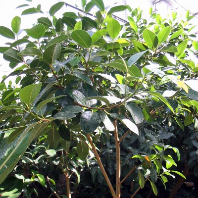 Ficus australis - Fico della lava esemplari. Molto resistente in interni, crea bellissimi effetti giungla con la sua lussurreggiante chioma, fitta di foglie di un bel colore verde scuro brillante e le sue originali radici aeree.